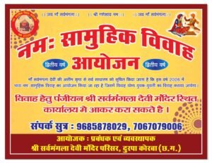 कोरबा/ छत्तीसगढ़ एक्सप्रेस: औद्योगिक नगरी कोरबा की अधिष्ठात्री देवी मां सर्वमंगला के पावन मंदिर परिसर में इस वर्ष भी भक्ति और सेवा का अद्भुत संगम देखने को मिलेगा। दरअसल नमः सामूहिक विवाह 2026 का भव्य आयोजन शीघ्र ही किया जा रहा है। आस्था और सामाजिक उत्तरदायित्व को समर्पित यह आयोजन इस वर्ष अपने द्वितीय वर्ष सोपान (दूसरे वर्ष) में प्रवेश कर रहा है।