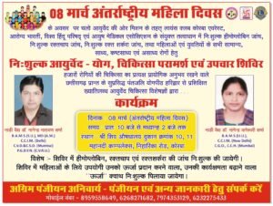 कोरबा / छत्तीसगढ़ एक्सप्रेस : 08 मार्च अंतर्राष्ट्रीय महिला दिवस के अवसर पर चलो आयुर्वेद की ओर मिशन के तहत निशुल्क हीमोग्लोबिन जांच, निःशुल्क रक्तचाप जांच, निशुल्क रक्त शर्करा जांच, तथा महिलाओं एवं युवतियों के सभी सामान्य, साध्य, कष्टसाध्य, एवं असाध्य रोगों हेतु निशुल्क आयुर्वेद-योग, चिकित्सा परामर्श शिविर दिनाँक 08 मार्च 2026 रविवार को लायंस क्लब कोरबा एवरेस्ट, विश्व हिंदू परिषद एवं आयुष मेडिकल एसोसिएशन के संयुक्त तत्वाधान में पतंजलि चिकित्सालय, श्री शिव औषधालय दुकान क्रमांक 10,11 महानदी काम्प्लेक्स निहारिका रोड कोरबा में प्रातः 10 बजे से मध्यान्ह 2 बजे तक आयोजित है ।