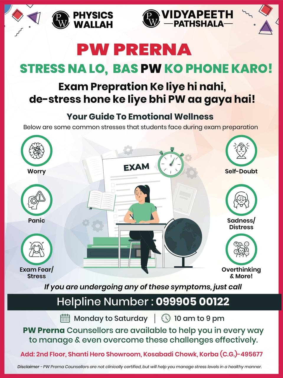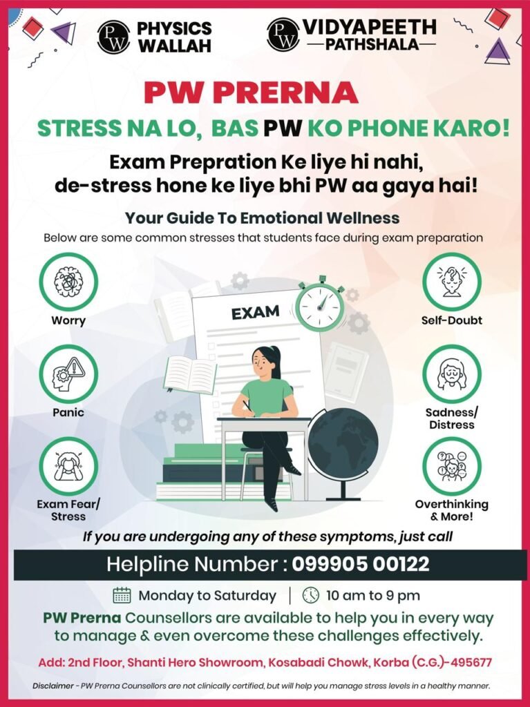 लेकिन ऐसे संवेदनशील दौर में फिजिक्स वल्लाह विद्यापीठ पाठशाला, कोरबा ने एक जिम्मेदार और सराहनीय पहल करते हुए “PW प्रेरणा – Your Guide to Emotional Wellness” हेल्पलाइन शुरू कर विद्यार्थियों को भावनात्मक सहारा देने का ठोस प्रयास किया है। यह पहल केवल एक औपचारिक सुविधा नहीं, बल्कि उन विद्यार्थियों के लिए जीवनरेखा साबित हो सकती है, जो परीक्षा के दबाव, असफलता के डर, आत्म-संदेह और मानसिक उलझनों से जूझते हुए खुद को अकेला महसूस कर रहे हैं।