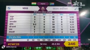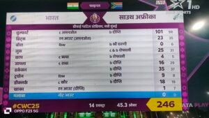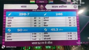 साउथ अफ्रीका ने टॉस जीतकर भारत को पहले बल्लेबाजी का न्योता दिया, भारत टीम ने निर्धारित 50 ओवरों में 7 विकेट होकर 298 रन बनाएं…. भारत की ओर से शेफाली वर्मा ने 87 दीप्ति ने 58 स्मृति ने 45 रनों का योगदान दिया. जवाब में 298 रनों को चेस करने उतरी दक्षिण अफ्रीका की पूरी टीम 45.3 ओवर में 246 रन ही बना सकी…. दक्षिण अफ्रीका की कप्तान ने शानदार शतकीय पारी खेली लेकिन वह अपनी टीम को जीत नहीं दिला पाई… और दक्षिण अफ्रीका की पूरी टीम 246 रनों पर आउट ही गई.. इस तरह भारतीय टीम ने 52 रनों से यह मैच अपने नाम कर लिया और वर्ल्ड कप जीतने वाली दुनिया की चौथी टीम बन गई…।।